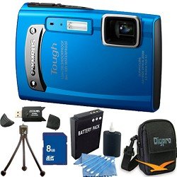 Olympus Tough TG-310 14 MP Waterproof Shockproof Freezeproof Digital Camera (Blue) with 2.7" LCD, 3.6x Zoom Lens, 720p HD Video, and more. Kit includes 8GB Memory Card, Card Reader, Li-ion battery, Tripod, Deluxe Carry Case, and Lens Cleaning Kit. Overview